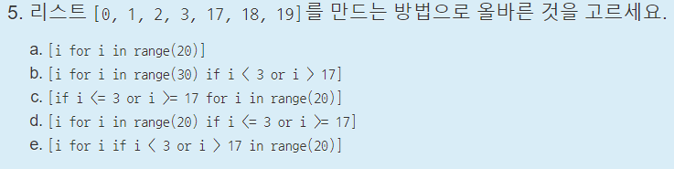 d : 표현식을 이용한 방법인데, 먼저 범위는 20까지 주어지고 3보다 작거나 같거나, 17보다 크거나 같은 값을 i에 넣는다면 주어진 리스트를 만들 수 있다.