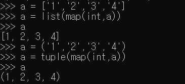 리스트나 튜플의 값들을 map을 사용한다면 모든 요소들을 한번에 다른 자료형으로 바꿔줄 수있다.