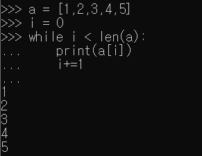 변수 i를 인덱스 용도로 쓰고 while의 조건식을 a의 길이에 벗어났는지를 측정하는데 쓰면 리스트의 요소들을 오류없이 출력해낼 수 있다.