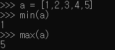 위 사진처럼 min(<변수>) 혹은 max(<변수>)를 써준다면 그 리스트에서의 큰값 작은값을 구해준다.