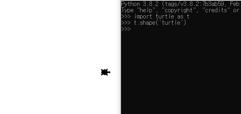shape('turtle')를 작성하면 gui 창이 뜨고 거북이가 나타나게 해준다.