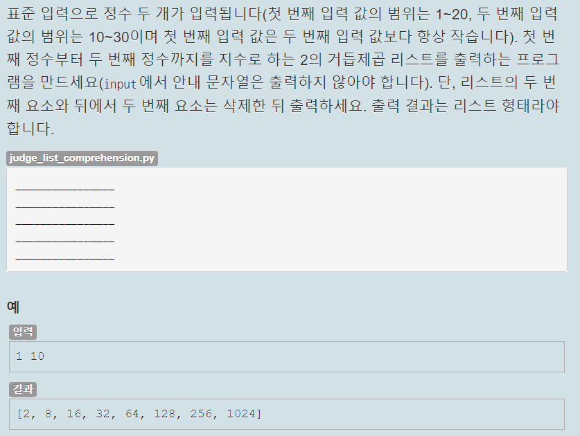 입력 받은 첫번째 값부터 두번째 값까지를 지수로하는 2의 거듭제곱 리스트를 출력하는 것이 목적이다.