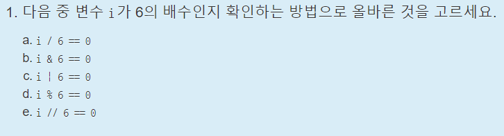 i가 6의 배수인지 확인하는 방법은 i를 6으로 나눴을 때 나머지가 0인지를 확인하면 된다. 따라서 i % 6 == 0이 적힌 d가 정답이다.