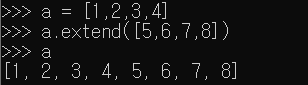 위 사진처럼 list a에 extend를 써주니 a에 5,6,7,8이 연결된 것을 알 수 있다.