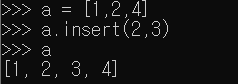 insert는 append, extend와 달리 원하는 위치에 값을 추가해주는 함수다. insert(<인덱스>,<요소>)로 써주면 된다.