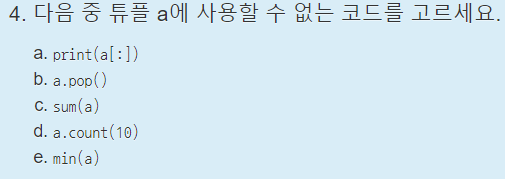 튜플은 값의 변환, 삭제가 불가능하다. pop은 값을 삭제하는 명령어이므로 튜플에는 사용할 수 없다.
