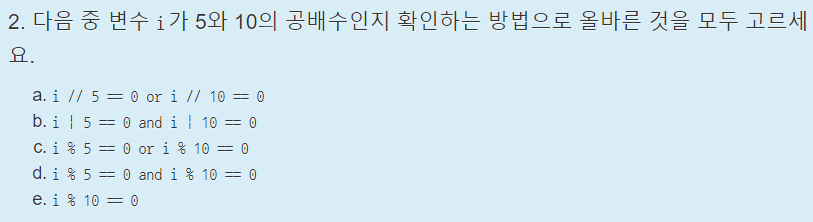 공배수를 확인하는 방법은 and 조건을 걸어서 두수로 각각 나눴을 때 나머지가 0인지 확인하는 방법과, 두 수를 곱한 값으로 i를 나눠서 나머지가 0인지 확인하는 방법을 쓰거나 두수가 서로 배수 관계일 경우 배수인 수로 나눴을 때 0이 되는지 확인하는 방법이 있다. 따라서 i % 5 == 0 and i % 10 == 0인 d가 맞다. 또한 e도 맞다.