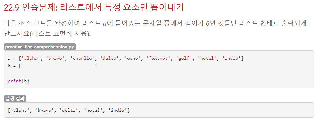len(i)를 이용하면 문자열의 길이를 구할 수 있다. 이를 이용해서 len(i) == 5만 i에 넣어준다면 위 실행결과처럼 출력할 수 있다.