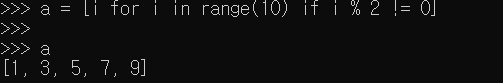 위 코드는 for로 list를 생성하면서 그 수가 홀수인 값만 뽑아서 리스트에 저장하는 동작을 한다.