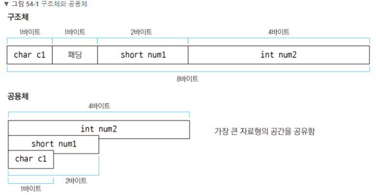 공용체는 구조체와 정의 방법은 같지만 멤버를 저장하는 방식이 다른 자료형이다. 구조체는 멤버들이 각각 공간을 차지하지만 공용체는 모든 멤버가 같은 공간을 공유한다.