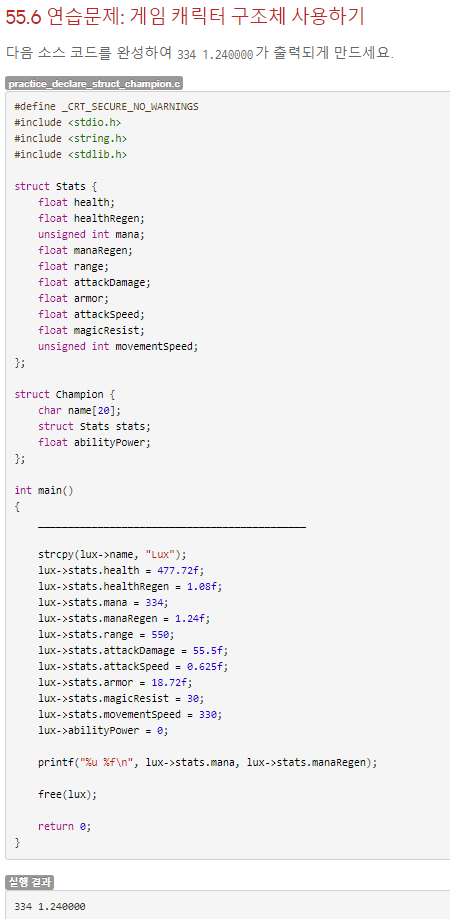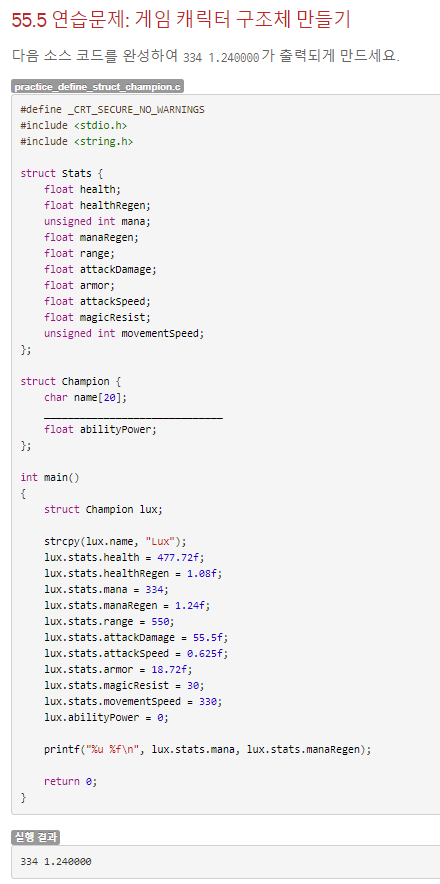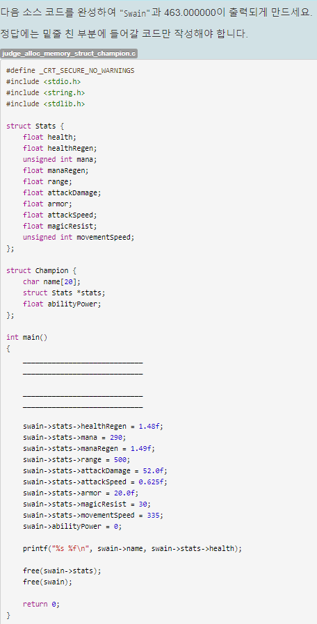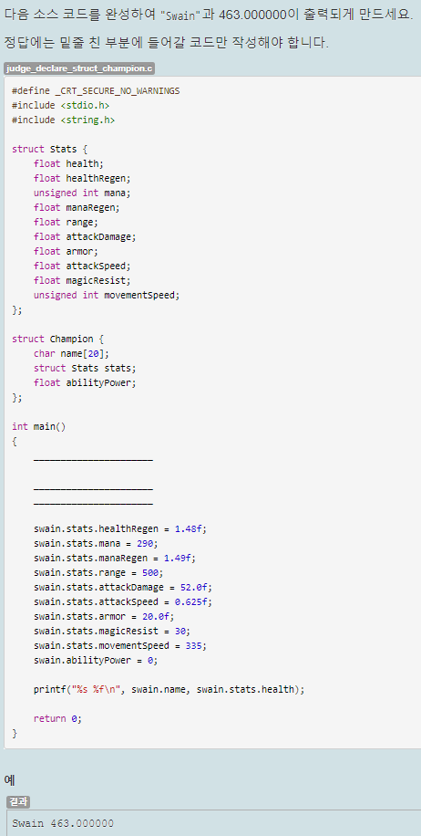 Champion 구조체 변수를 선언하고 name 멤버에 Swain을 저장, 구조체 변수 안의 구조체 변수 stats의 health에 463.0을 저장하는 것이 목적이다.