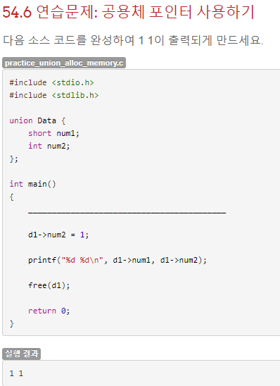 위 코드처럼 malloc과 포인터 변수를 이용해 공용체의 메모리를 동적할당할 수 있다. 마찬가지로 값에 접근할 때는 .이 아닌 ->로 해줘야한다.