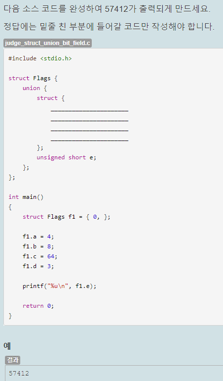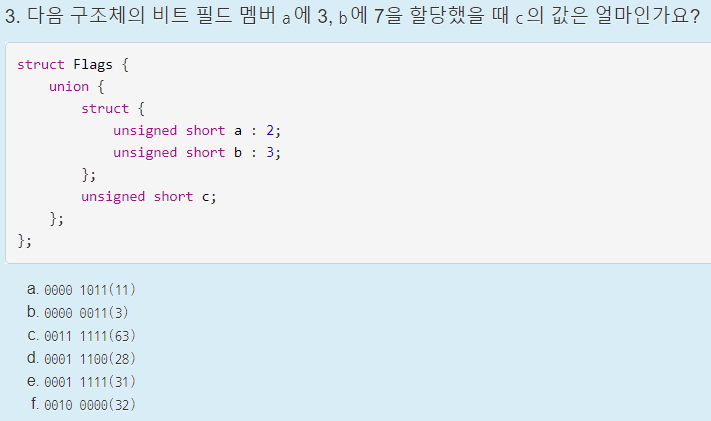 마찬가지로 공용체에서도 역시 비트 필드를 사용할 수 있다. 위 코드는 a, b, c를 1, 2, 4 bit 크기로 선언하고 d와 공간을 나눠쓰도록 했는데 이 a, b, c에 각각 값을 넣어주고 d 멤버의 값을 출력하게 작성했다.