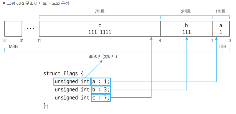 위 사진처럼 자료형의 비트 아래 각 멤버들의 비트 수들이 최하위 비트(가장 작은 값)부터 차례대로 배치된다.