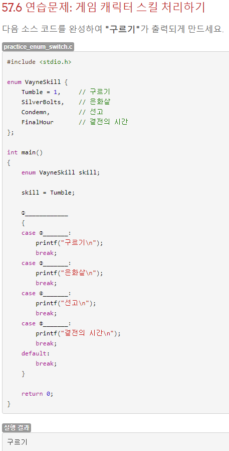 정의돼 있는 열거형과 열거형 변수를 바탕으로 switch문을 작성해 구르기를 출력하는 것이 목적이다. 열거형 변수에는 Tumble이 들어가 있으므로 switch의 맨 첫 case가 작동되도록 Tumble을 넣어주면 될 것 같다.