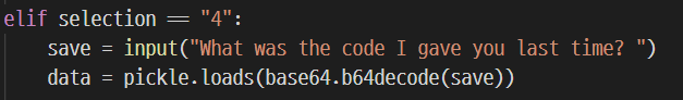 print(f"Here you go! Come back and try again! \"{base64.b64encode(pickle.dumps(data)).decode()}\"")