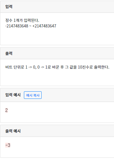 입력 된 값을 비트 단위로 1 -> 0, 0 -> 1, 즉 not 연산을 해서 만들어진 값을 10진수로 출력하는 것이 목적이다.