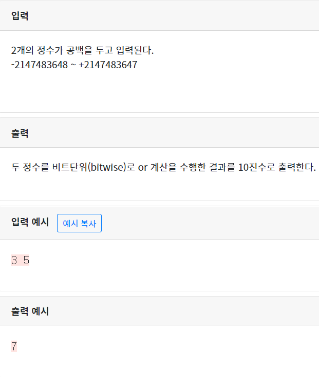 입력 된 두 값을 비트 단위로 or 연산해서 만들어진 값을 10진수로 출력하는 것이 목적이다.
