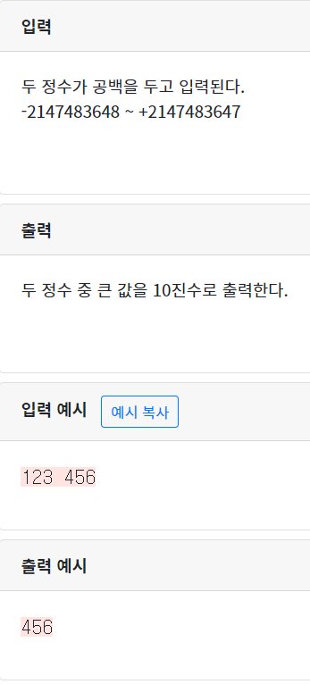 입력 된 두 값중, 더 큰 값을 출력하는 것이 목적이다.