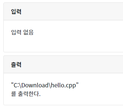 위의 출력처럼 파일 경로 "C:\Download\hello.cpp" 출력이 목적이다. 단 큰 따음표 포함으로 출력해야한다.