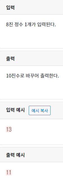 위에 정리해놓은 비트 단위 논리 연산자를 사용해서 풀었다. 위 문제는 비트 단위 not 연산이 필요하므로 먼저 input을 정수형으로 변환한 다음 2진수로 바꿔주는 bin으로 2진수로 바꿔주는데, 이때 비트 단위 not을 의미하는 ~를 붙여서 not 연산이 된 상태로 2진수로 변환했다. 그 다음 not 연산이 된 2진수를 다시 int(<값>,2)로 10진수로 변환한 후 출력하도록 작성했다.
