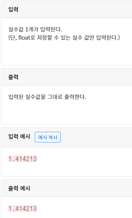 처음에는 print(float(input()))로 코드를 작성했는데, 틀렸다는 결과가 나와서 놀랐었다.