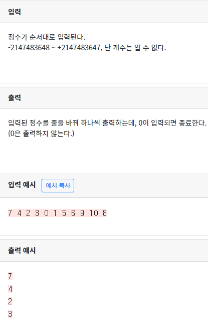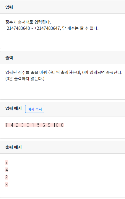 무작위 개수로 정수가 입력되는데, 이를 순서대로 줄을 바꿔 출력하는 것이 목적이다. 단 0이 입력된다면 종료해야한다.