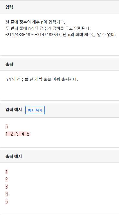 첫 줄에 입력 될 개수가 입력되고 두 번째 줄에 개수만큼 정수가 공백으로 구분되어 입력 된다고 한다. 이 정수들을 줄을 바꿔 출력하는 것이 목적이다.