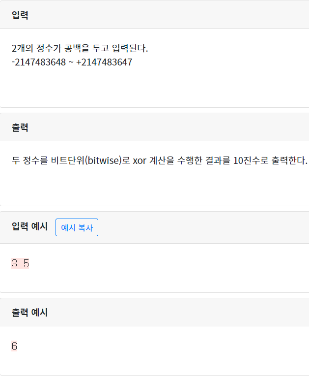 입력 된 두 값을 비트 단위로 xor 연산해서 만들어진 값을 10진수로 출력하는 것이 목적이다.