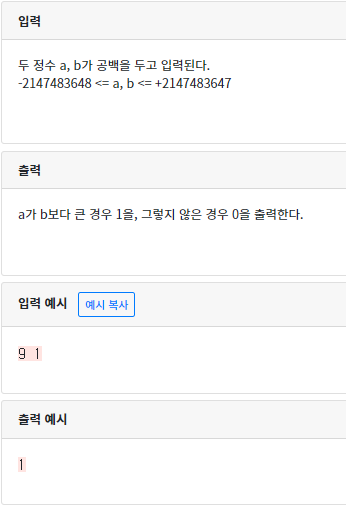 1줄 if문을 사용해서 작성했다. 같을 경우에 대한 조건이 없어서 if a > b일 경우 a를 출력, 아닐 경우 b를 출력하도록 했다.