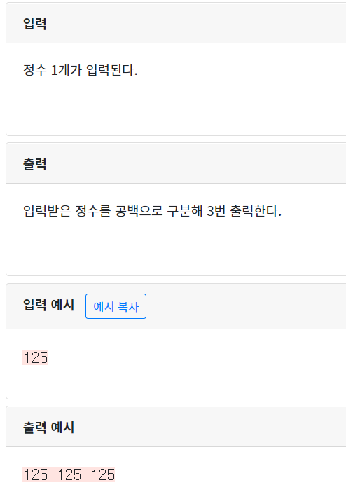 입력받은 정수를 공백으로 구분해 3번 출력하는 것이 목적이다.