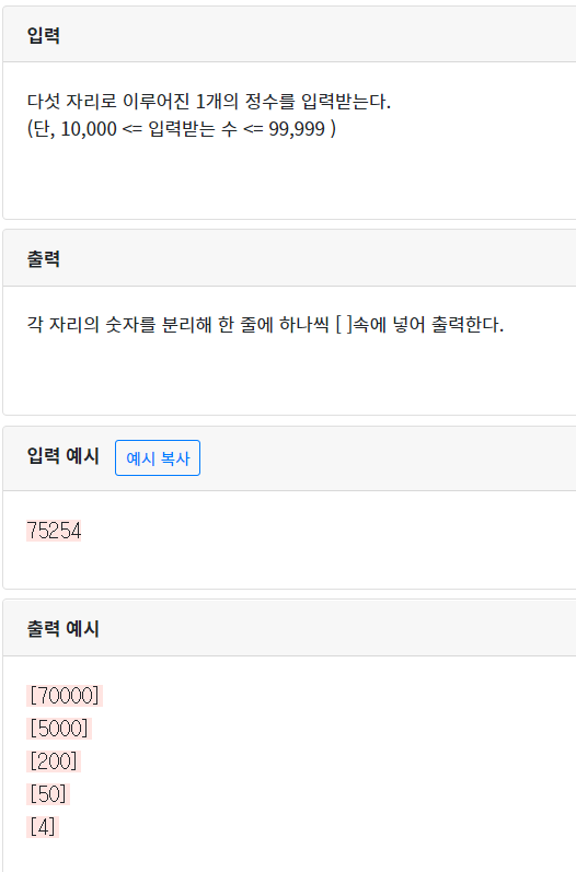 다섯자리의 숫자가 입력되면 그 숫자를 각 자리의 숫자로 분리해 [ ]로 감싸서 출력하는 것이 목적이다.