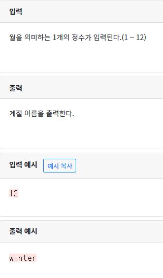 입력 된 월에 해당되는 계절 이름을 출력하는 것이 목적이다.