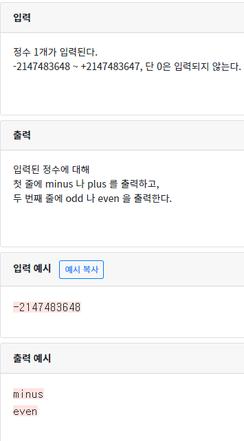 입력 된 1개의 정수가 플마 여부를 확인하고 첫 줄에 'minus', 'plus'를 조건에 맞게 출력, 두번째 줄에는 짝홀 여부를 확인하고 조건에 맞게 'even', 'odd'를 출력하는 것이 목적이다.