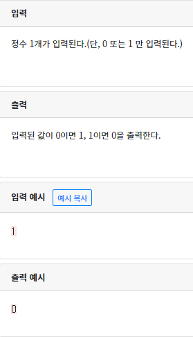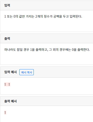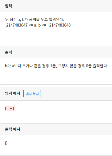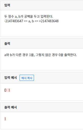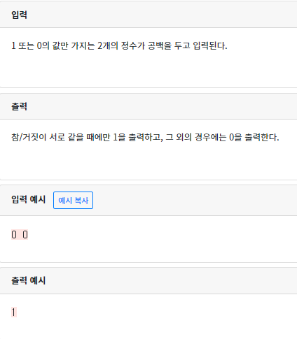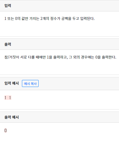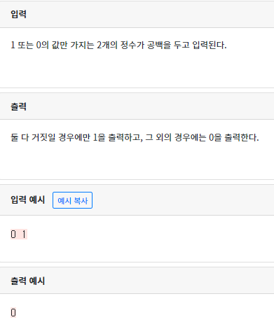 1줄 if문의 조건식으로 a == b == 0을 사용해서 a, b가 0(False)라면 1을, 아니라면 0을 출력하도록 작성했다.