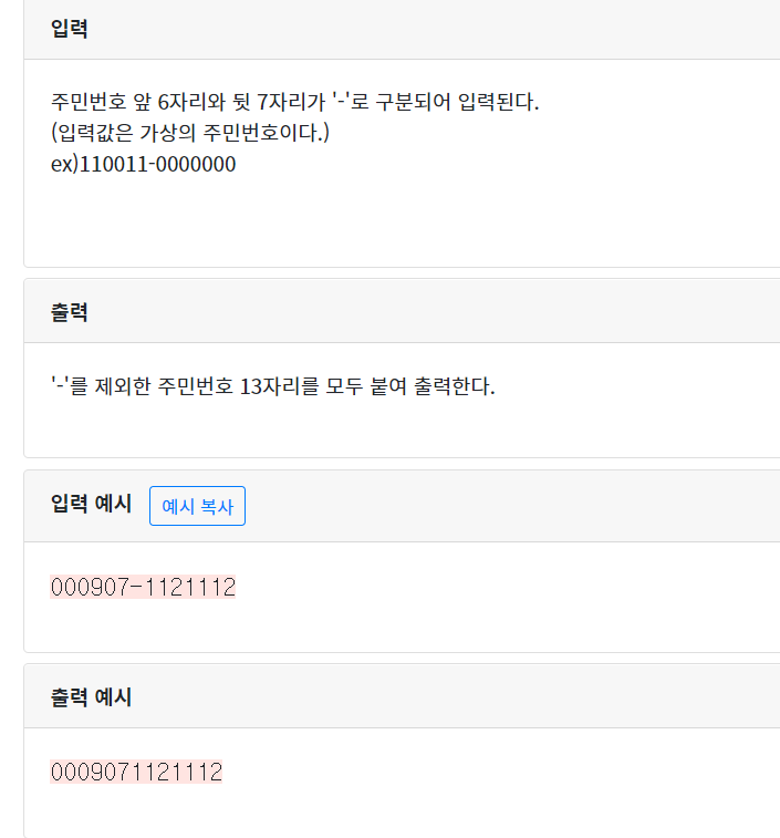 13자리로 이루어진 주민번호가 '-'로 구분되어 앞 6자리, 뒤 7자리가 입력되는데, 입력된 주민번호를 '-'를 뺀 상태로 출력하는 것이 목적이다.