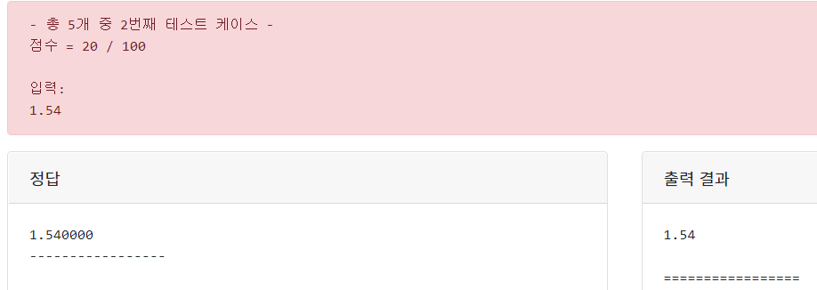 오류 정보를 확인해보면 정답은 소수점 6자리까지 출력하는데 값이 6자리가 안채워질 경우에는 0으로 채워줬다. 그래서 코딩도장에서 배웠던 %f를 응용하여 %.6f로 해당 값을 소수점 6자리로 출력되도록 만들었다.