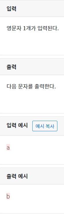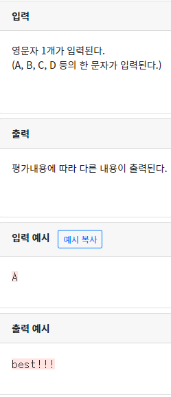 영문자 1개가 입력되면 평가 내용에 맞게 내용을 출력하는 것이 목적이다.