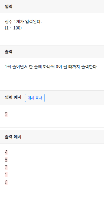 입력 된 값을 1씩 줄여 0이 될 때까지 출력하는 것이 목적이다.