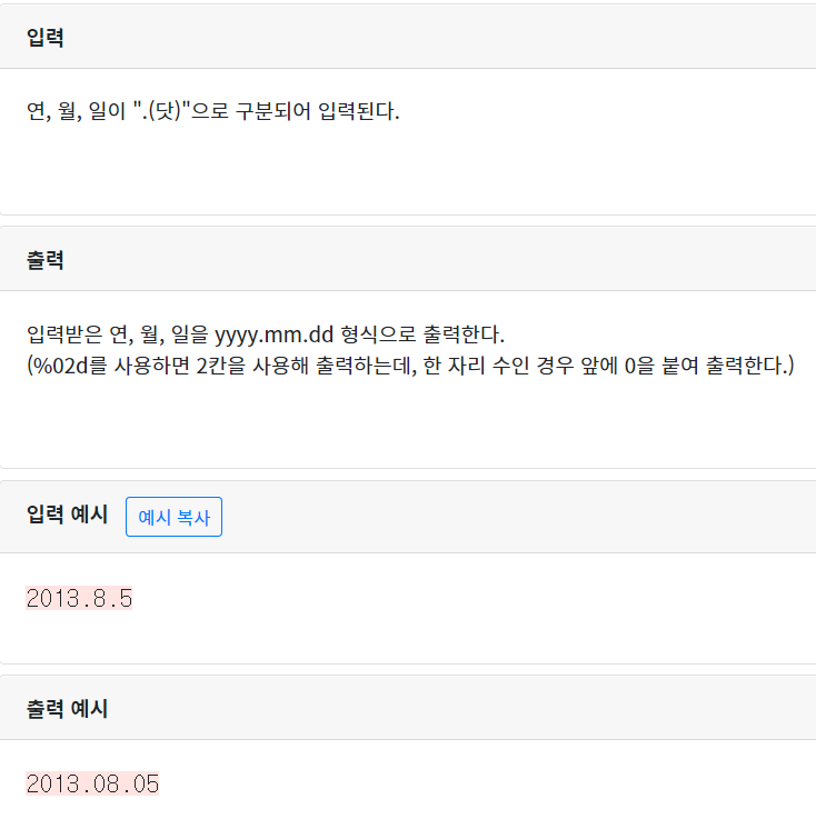 연.월.일 형식으로 입력되는데 이를 연.월.일 형식으로 출력하는 것이 목적이지만, 단 월, 일이 한 자리 수인 경우 앞에 0을 붙여서 출력해야한다.