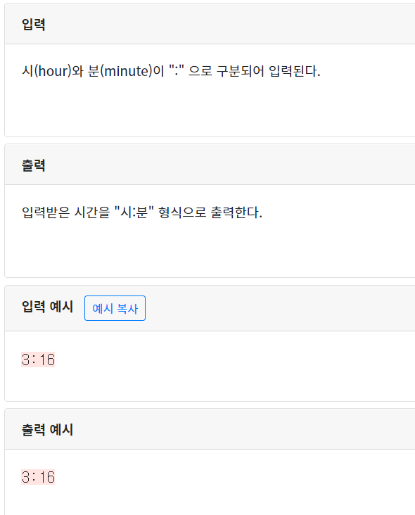 입력 예시와 출력 예시를 봤을 때, 그대로 출력해도 상관없을 것 같지만 혹시 모르니 :를 기준으로 split 시켜 두 변수에 담고, print를 하는데 이때 공백없이 시:분 형식으로 출력되야하므로 sep="" 옵션을 줘서 문제를 풀었다.