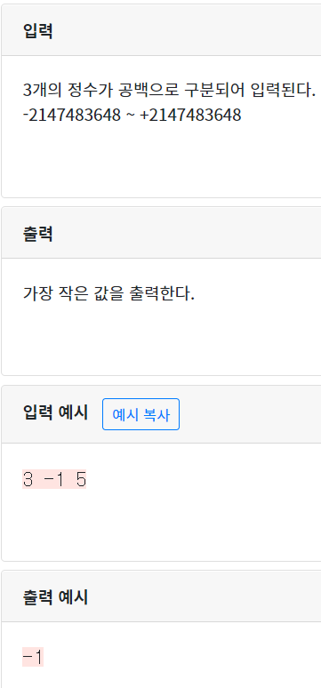 입력 된 세 값중 가장 작은 값을 출력하는 것이 목적이다.