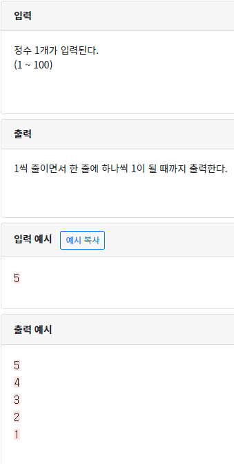 range(<시작값>,<끝값-1>,<증감폭>)을 사용해서 문제를 해결했다. for문으로 루프를 돌리는데 range로 시작값을 입력값으로 정하고, 끝값을 1까지 출력해야하므로 0, 그리고 증감폭을 -1로 지정해서 입력된 값이 1이 될때까지 -1하고 그 값을 출력하도록 작성했다.