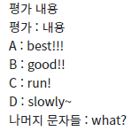 1068의 조건을 문자로 바꿔서 작성했다. 입력 된 값이 저장 된 a가 'A'일 경우 'best!!!'를, 'B'일 경우 'good!!'을, 'C'일 경우 'run!'을, 'D'일 경우 'slowly~'를, A,B,C,D에 해당되지 않을 경우 'what?'을 출력하도록 ==을 사용해서 작성했다.
