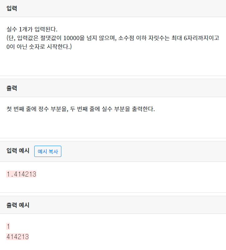 실수 1개가 입력되는데, 이 실수의 정수 부분을 첫 번째 줄에, 소수 부분을 두 번째 줄에 출력하는 것이 목적이다.