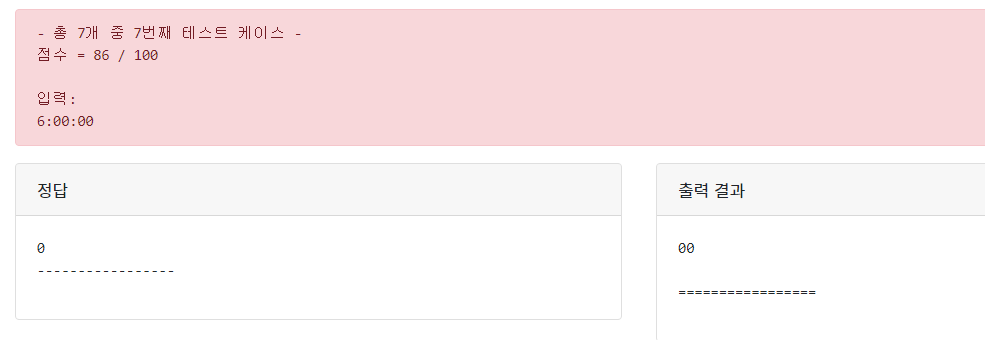 그래서 1줄 if문으로 time[1]이 '00'이 아닐 경우 그대로 출력하고, 만약 '00'일 경우 '0'만 출력하도록 코드를 작성했다.