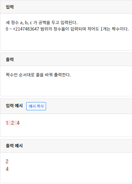 입력 된 세 값중 짝수만 순서대로 줄을 바꿔 출력하는 것이 목적이다.