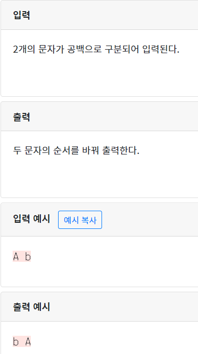 2개의 문자가 공백으로 구분되어 입력되는데, 이 두 문자를 순서를 바꿔서 출력하는 것이 목적이다.