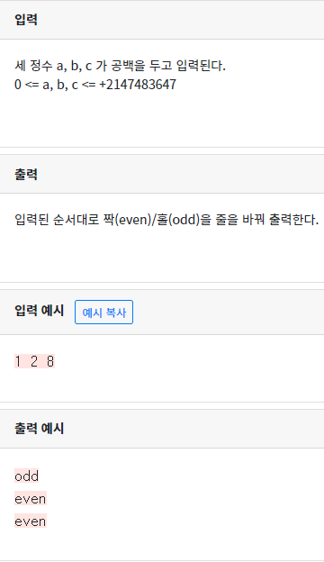 입력 된 세 값 순서대로 각각 짝수면 'even'을, 홀수면 'odd'를 출력하게 하는 것이 목적이다.