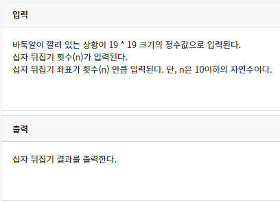 바둑판의 상황이 19 * 19로 입력되고, 십자 뒤집기 횟수가 입력된다. 십자 뒤집기의 좌표가 횟수 만큼 입력되는데, 그 좌표 기준으로 십자 뒤집기를 해주면 된다.